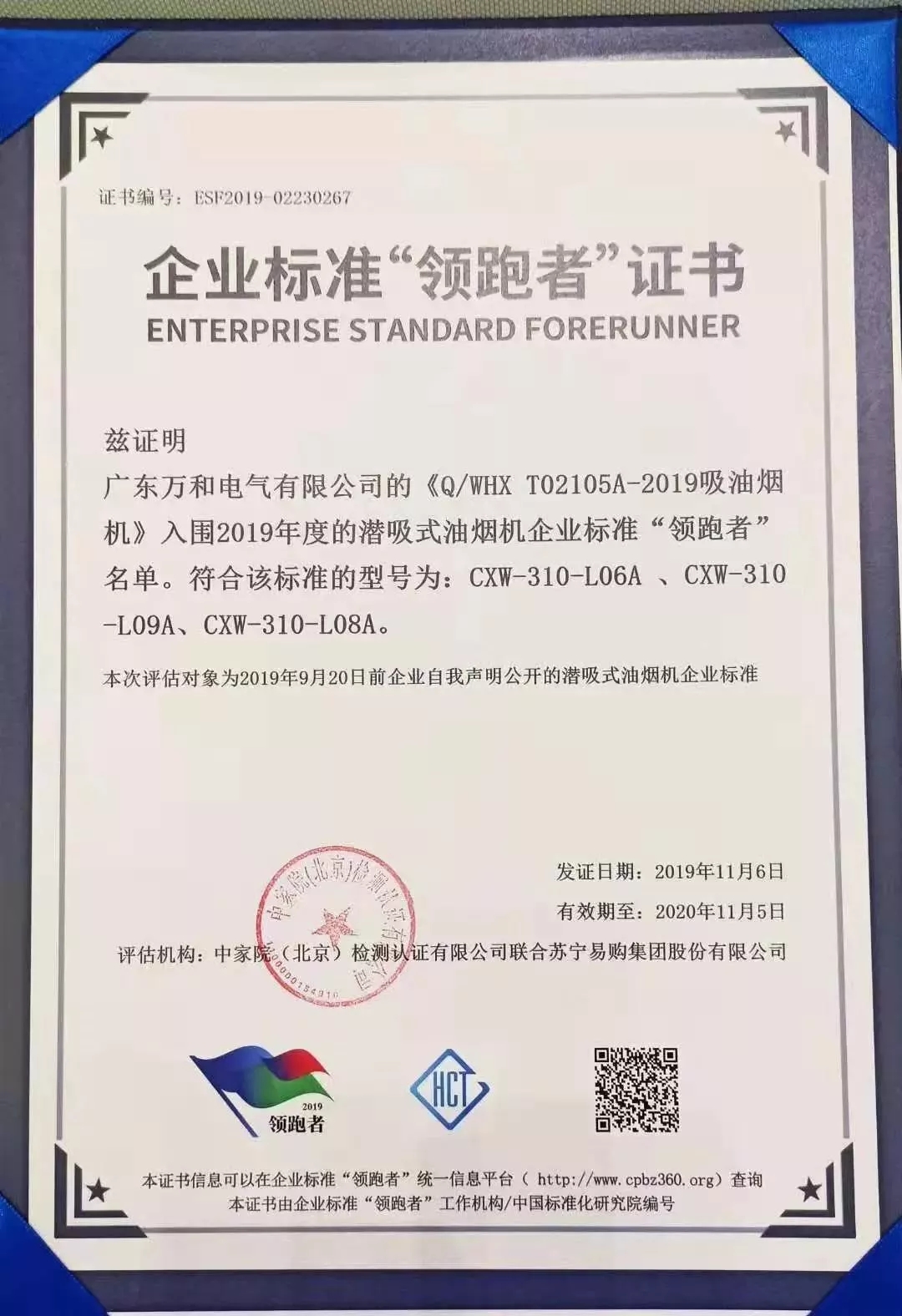 在11月6日召开的2019企业标准“领跑者”年度大会上,凭借高要求的产品标准及卓越的品质,华体会(中国)三款潜吸式油烟机CXW-310-L06A、CXW-310-L08A 、CXW-310-L09A荣获企业标准“领跑者”证书,是潜吸式烟机中唯一获奖品牌。