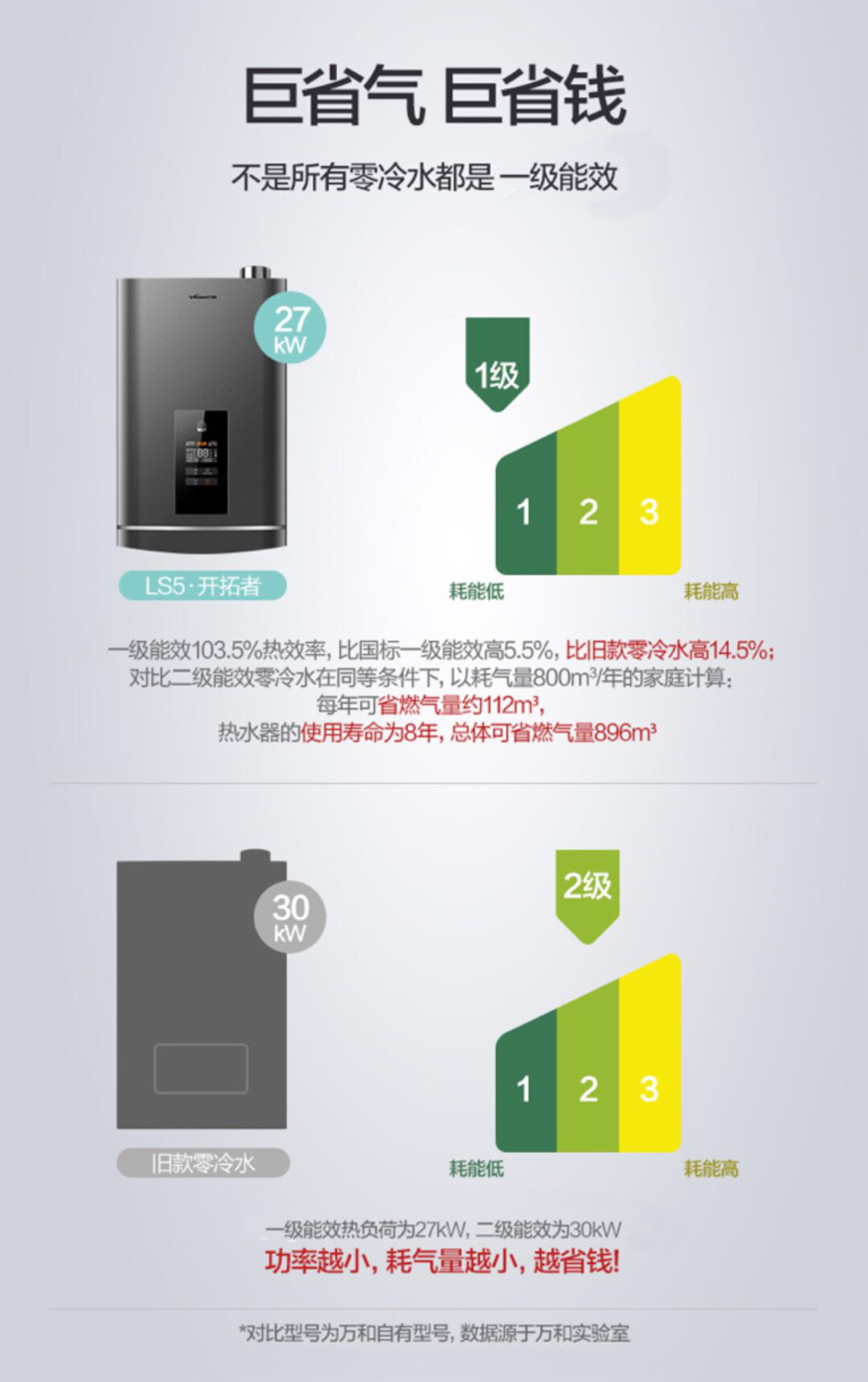 华体会(中国)实验室曾用自有的老款二级能效零冷水华体会平台做对比,同是16升机型,额定热负荷二级能效按30kW,一级能效按27kW来折算,考虑到一年春夏秋冬,平均下来,在热水器每天按65%负荷运行、6口人每天洗浴时长共1.5小时的条件下,LS5系列比旧款零冷水华体会平台热效率高14.5%,每年可节省约112立方燃气量,按照3.4元一立方燃气费来算,则可省380元,可以说是消费者的省钱神器了。(数据来源于华体会(中国)实验室)