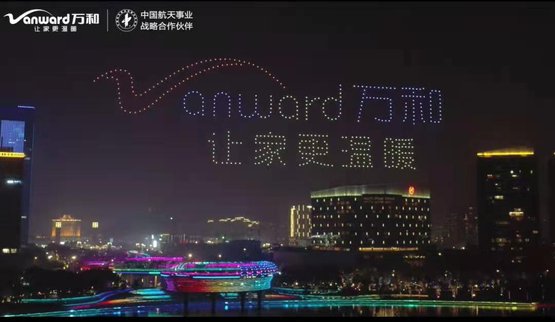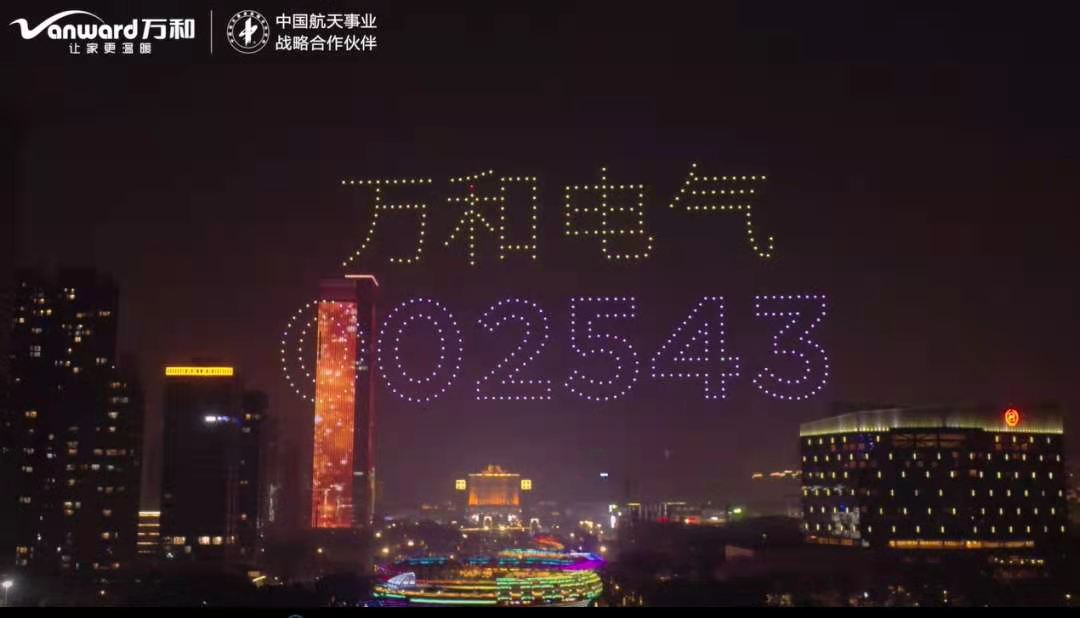 2021年1月27日晚,美丽的德胜河畔,流光溢彩的“金凤凰”广场,500架无人机腾空而已,相继变幻出“华体会(中国)电气 002543”、“上市十周年”、“花洒一开、热水即来”、“全球5000万家庭的温暖选择”、“华体会(中国)LOGO”、“我爱华体会(中国)”、“我爱顺德”等文字和图案,为华体会(中国)电气(股票代码:002543)上市十周年送上一份贴心的礼物,也点亮了当晚顺德的夜空。