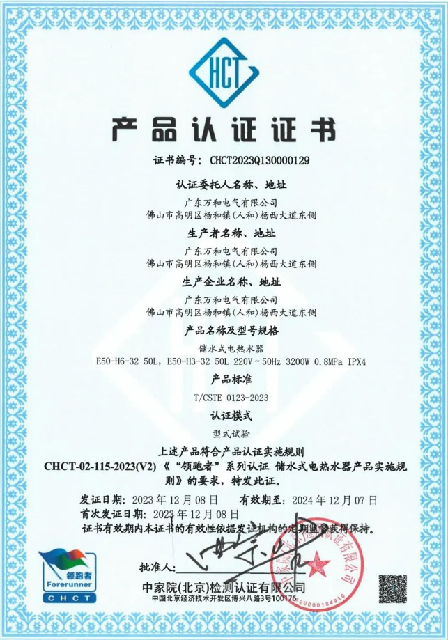 最近,中家院(北京)检测认证有限公司正式下发产品认证证书,认定由广东华体会(中国)电气有限公司(华体会平台子公司)生产的两款电热水器E50-H6-32和E50-H3-32双双通过“领跑者”系列认证。