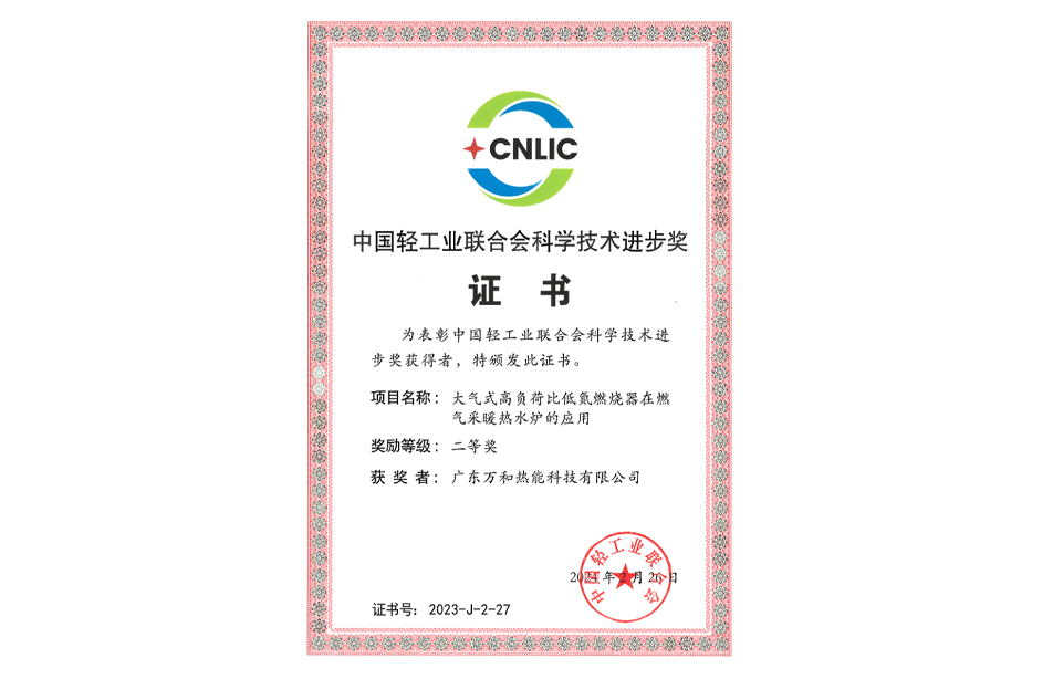 近日,中国轻工业联合会五届四次、中华全国手工业合作总社八届四次理事会在广元召开,会上公布了2023年度中国轻工业联合会科学技术获奖项目,由广东华体会(中国)热能科技有限公司(华体会(中国)电气子公司)研发的科技项目“大气式高负荷比低氮燃烧器在燃气采暖热水炉的应用”荣获中国轻工业联合会科学技术进步奖二等奖。