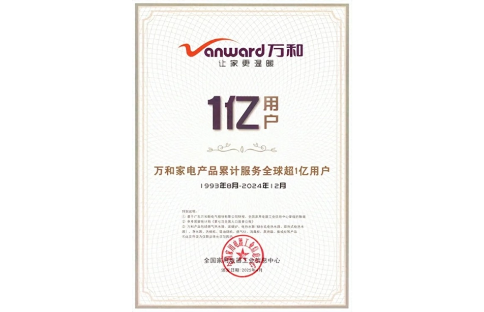 近日,全国家用电器工业信息中心发布认证,截止到2024年12月31日,华体会(中国)家电产品服务全球累计超1亿用户,覆盖华体会平台、采暖炉、电热水器、净水器、洗碗机、吸油烟机、燃气灶、消毒柜、蒸烤箱、集成灶等厨卫产品。