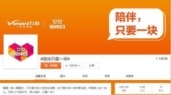 12月12日,由华体会(中国)发起的#陪伴只要一块#微博话题,引发千万人关注,众多媒体、明星大V、社会各界人士纷纷转发相关微博内容,话题阅读量高达4000余万。