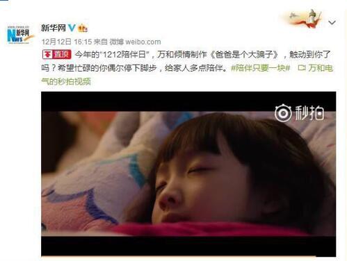 另外,此次传播的主视频《爸爸是个大骗子》,一经上线,便在微信和微博上持续发酵,掀起了全民刷屏呼吁陪伴的高潮。截至12月12日24点,全渠道视频的累积播放量已经突破500万人次。